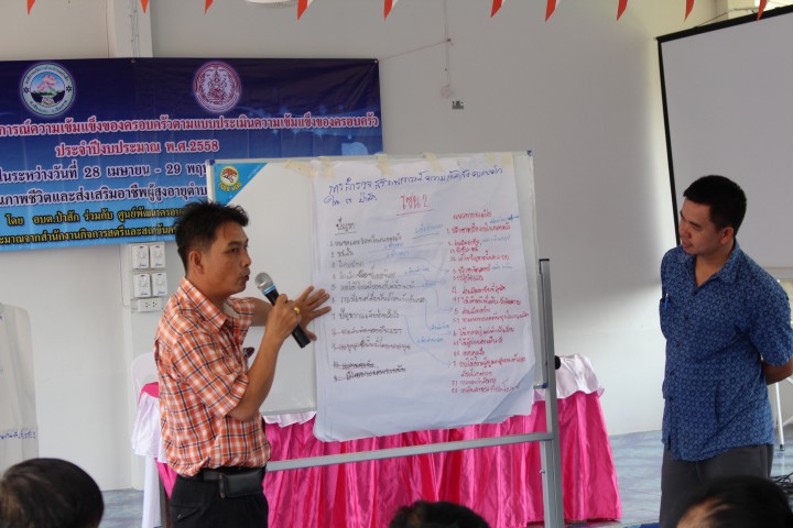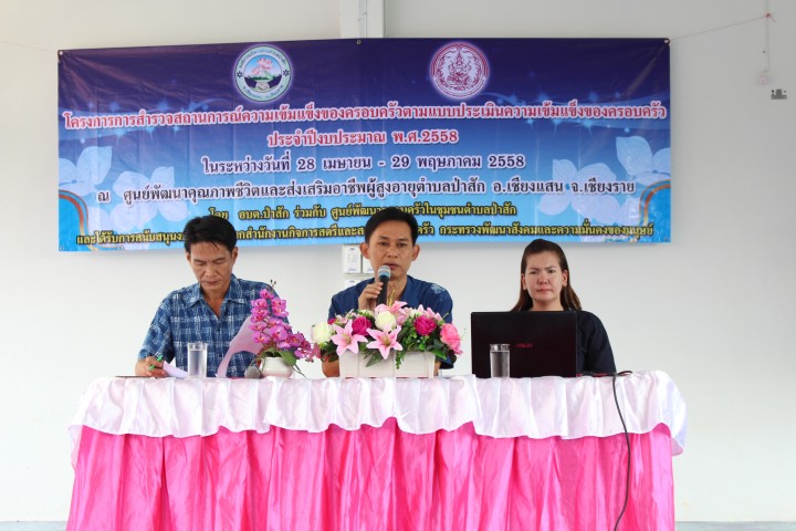 โครงการการสำรวจสถานการณ์ความเข้มแข็งของครอบครัวตามแบบประเมินความเข้มแข็งของครอบครัว ประจำปีงบฯ 2558 ในระหว่างวันที่ 28 เมษายน ถึง 29 พฤษภาคม พ.ศ.2558 ณ ศูนย์พัฒนาคุณภาพชีวิตและส่งเสริมอาชีพผู้สูงอายุตำบลป่าสัก